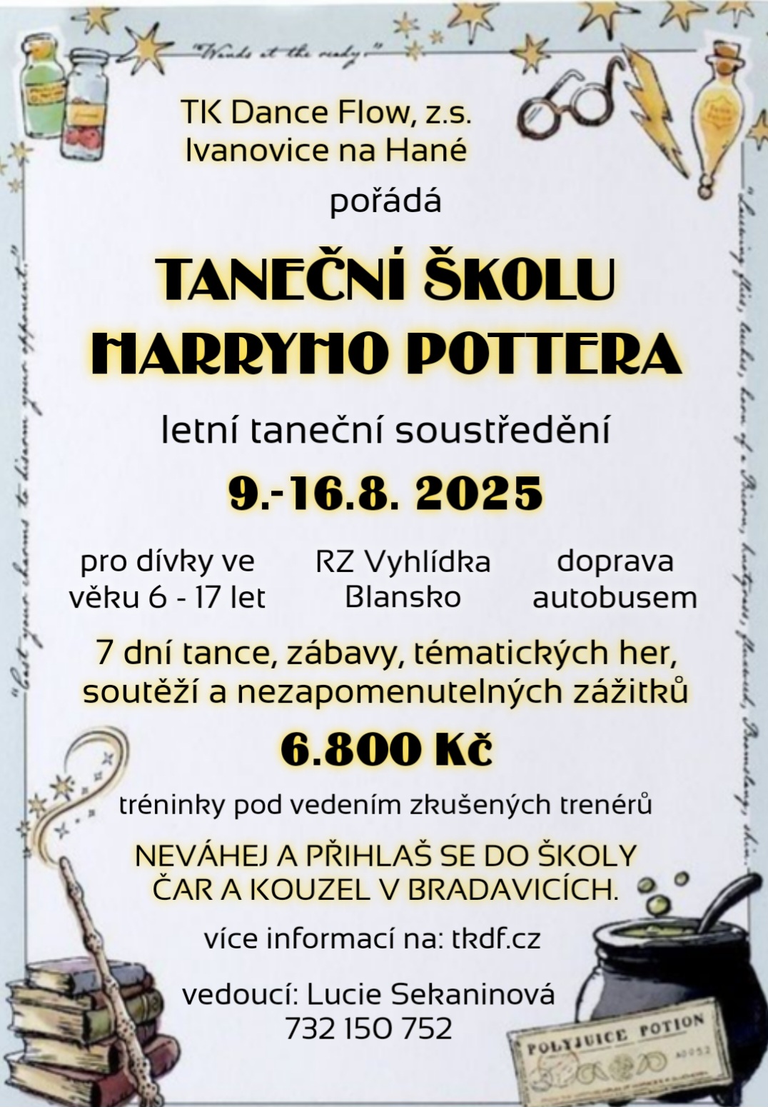 Jako každý rok pořádá náš klub Letní taneční soustředění v Rekreačním zařízení Vyhlídka u Blanska. Soustředění je pro členy, nové členy a nečleny klubu. Letos na téma TANEČNÍ ŠKOLA HARRYHO POTTERA. Tato akce v přátelském a zábavném prostředí je ideální pro nováčky, kteří by se chtěli přidat do našeho tanečního klubu.